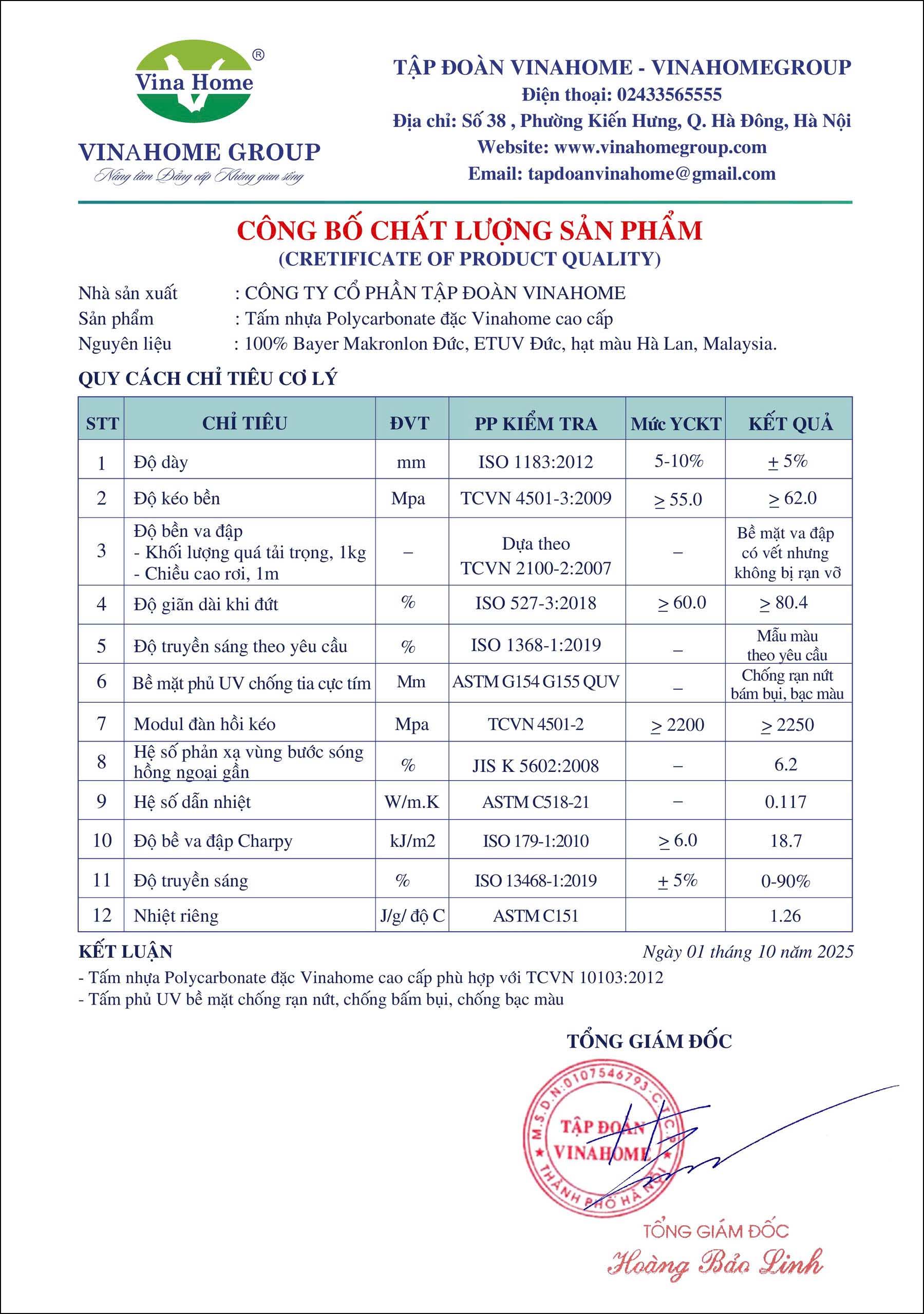 Chứng nhận chất lượng sản xuất và kinh doanh tấm nhựa Polycarbonate VinaHome