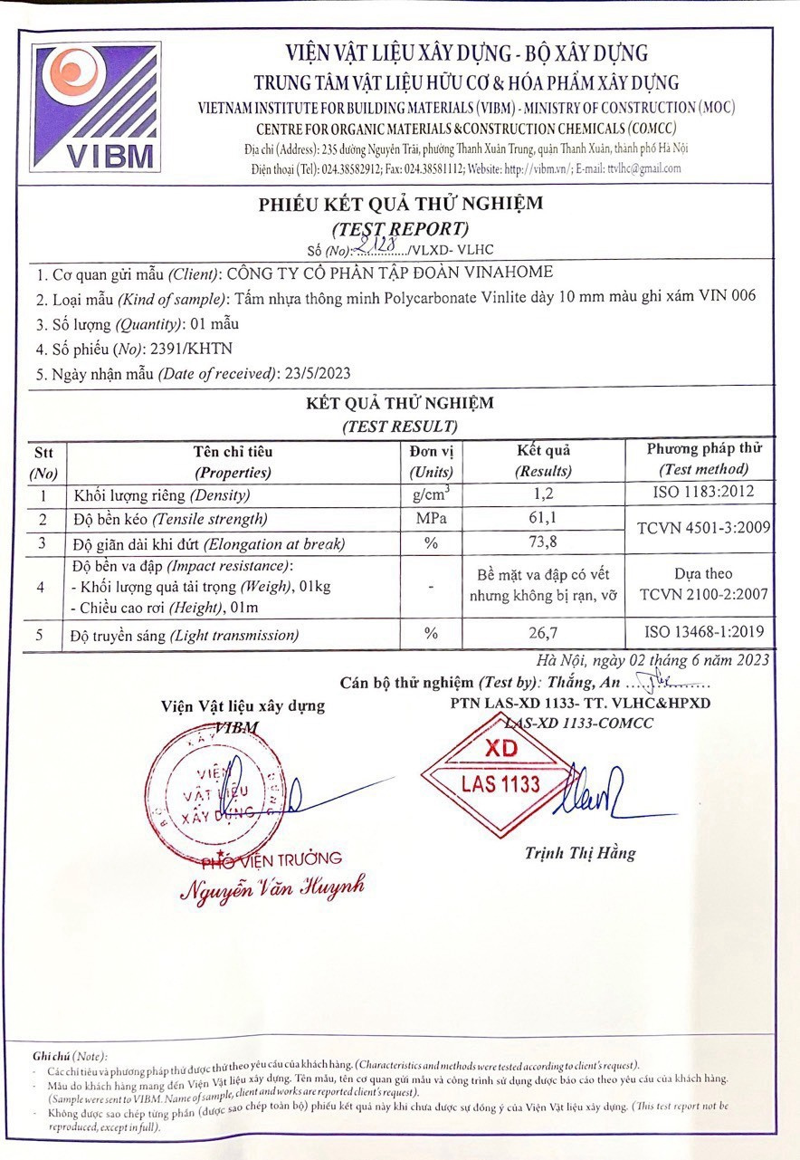 Chứng nhận chất lượng tấm nhựa lấy sáng poly tại Vinahome