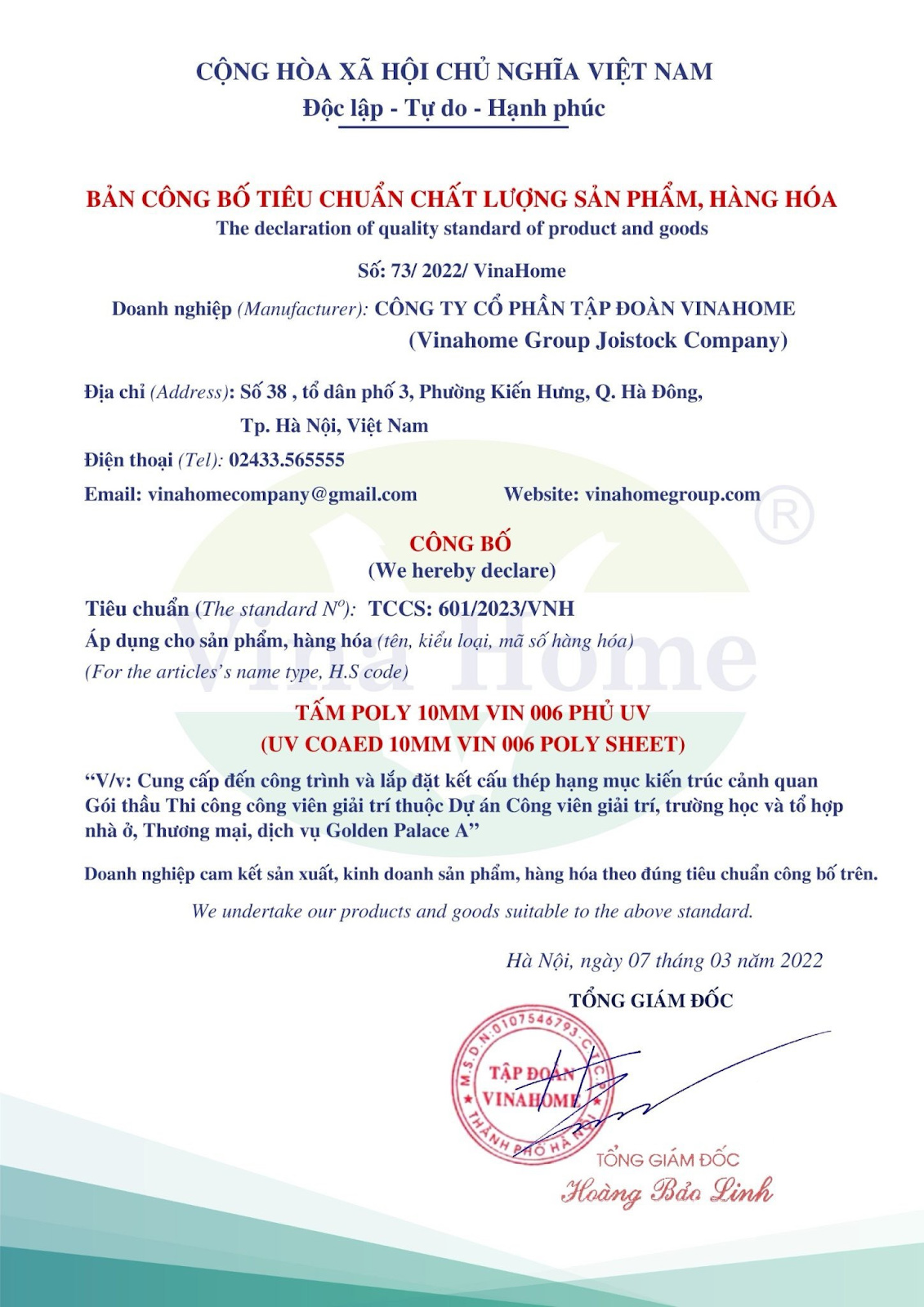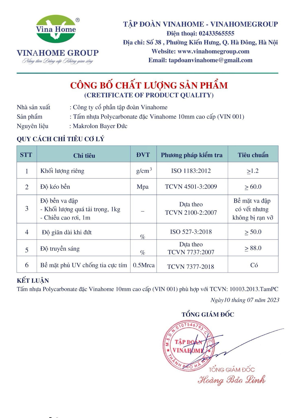 Công bố chất lượng sản phẩm tấm poly Vinlite tại Vinahome