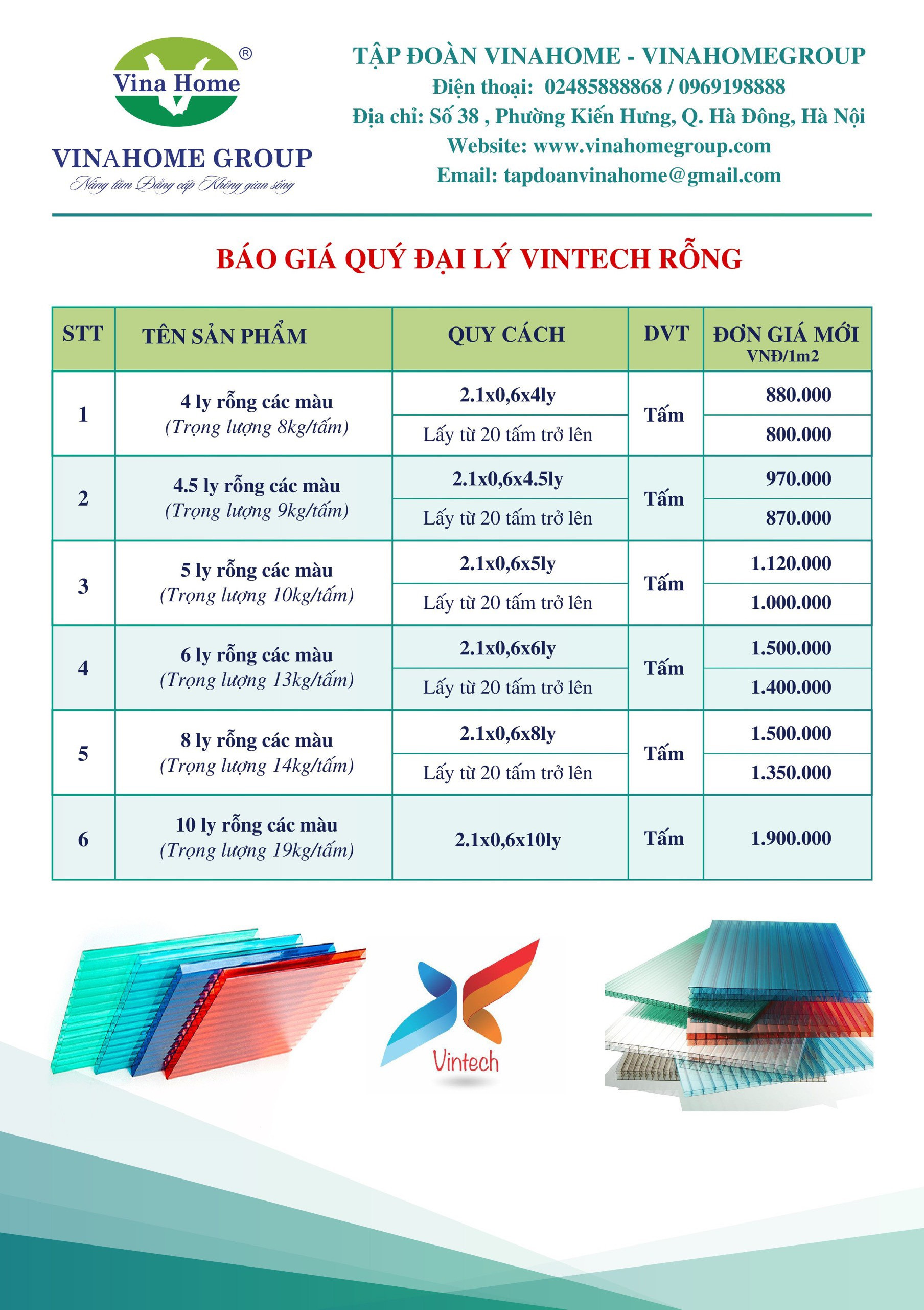 XIV. Báo giá tấm lợp polycarbonate rỗng Vinahome