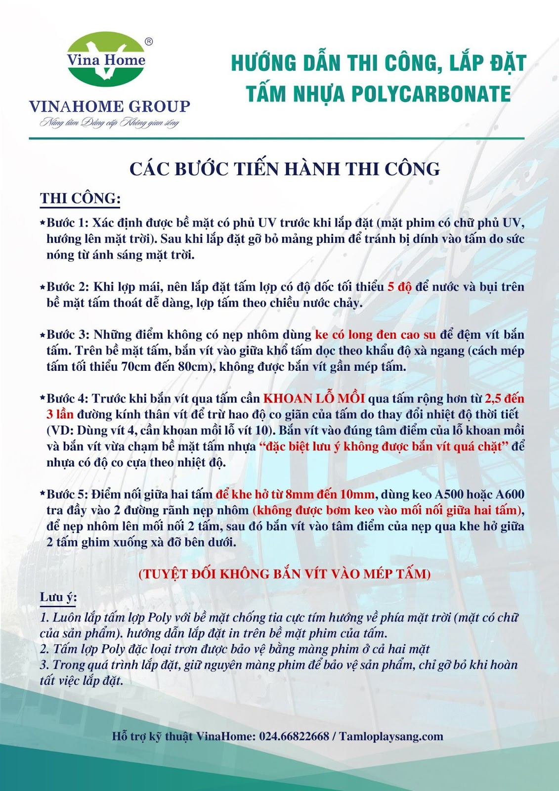 - Mặt tấm poly chống tia cực tím phải được hướng lên trên bằng các đánh dấu khi thi công để tránh nhầm lẫn.