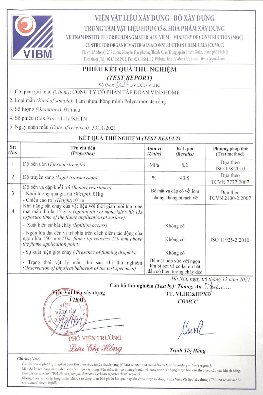 XII. Các quy cách kỹ thuật của tấm lợp thông minh rỗng ruột Vinahome